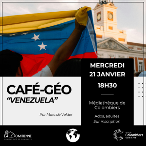 Mercredi 21 janvier 2026 à 18h30, la médiathèque de Colombiers vous propose un café-géo sur le thème de “Venezuela” par Marc de Velder. Une animation gratuite, sur inscription par mail à mediatheque.colombiers@ladomitienne.com ou par téléphone au 04.67.11.86.09…