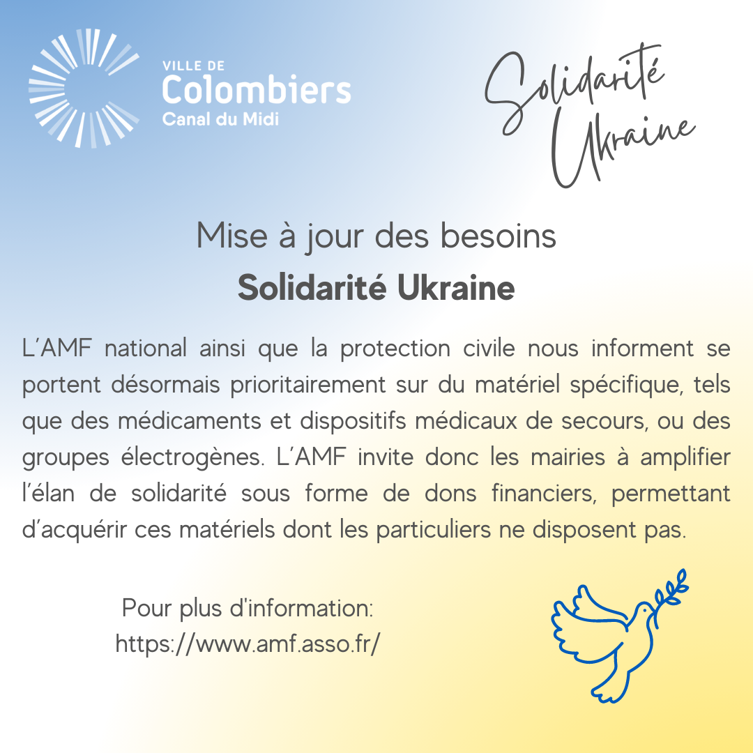 L’AMF national ainsi que la protection civile nous informent que les besoins se portent désormais prioritairement sur du matériel spécifique, tels que des médicaments et dispositifs médicaux de secours, ou des groupes électrogènes. L’AMF invite donc les mairies à amplifier l’élan de solidarité sous forme de dons financiers, permettant d’acquérir ces matériels dont les particuliers ne disposent pas.