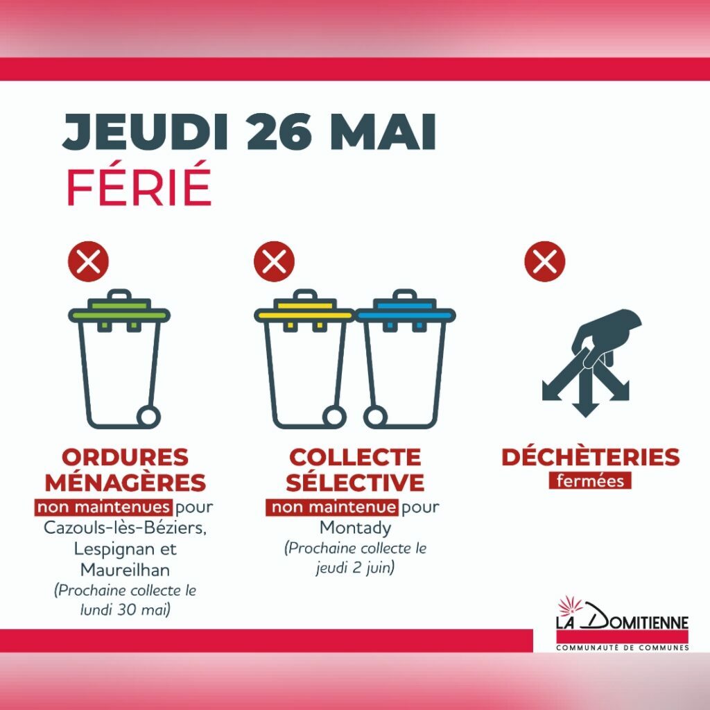 Les déchèteries de Nissan-lez-Enserune et Cazouls-lès-Béziers seront fermées le jeudi 26 mai.