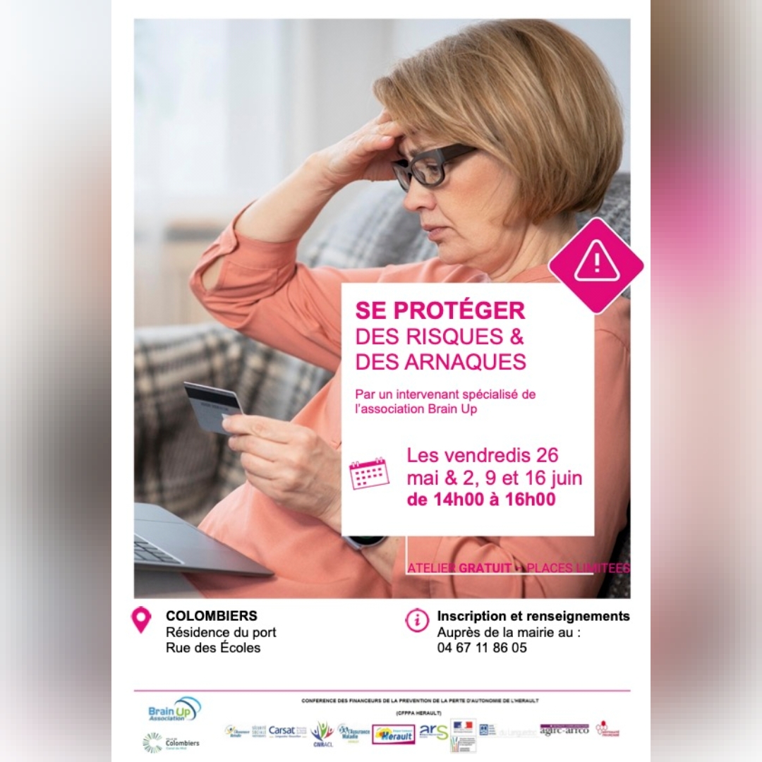 En partenariat avec l’association Brain Up, le CCAS de Colombiers vous propose de participer à ce programme « Se protéger face aux risques et aux arnaques », composé de 4 séances. Il vise à vous donner les conseils, les règles et les astuces pour se prémunir de ces situations de vie courante. Il ne s’agit pas d’apporter des conseils juridiques personnalisés sur des affaires en cours mais de partager les situations de vie et les bonnes pratiques de chacun.