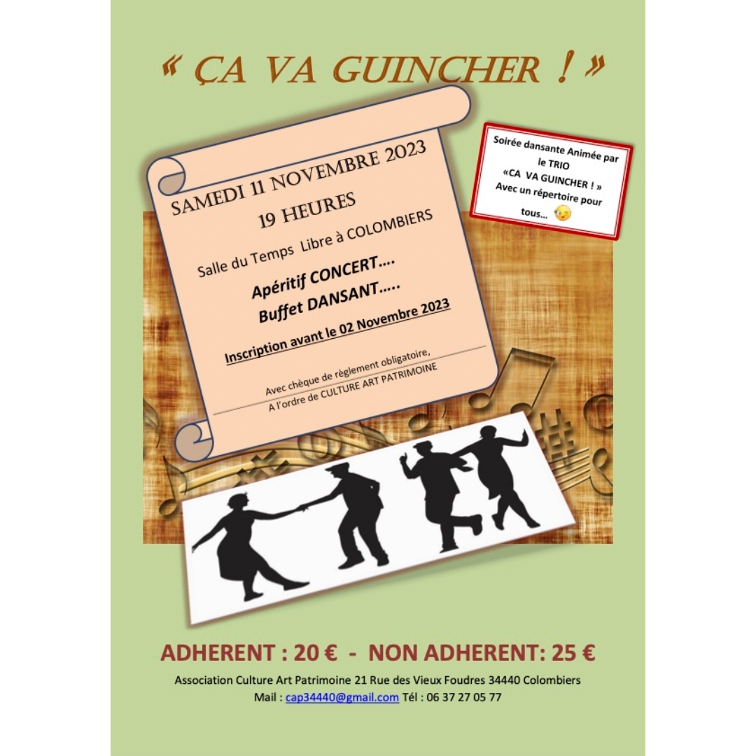 L’Association CAP (Culture Art Patrimoine) organise une soirée dansante animée par le trio “CA VA GUINCHER”, avec un répertoire pour tous 🥳