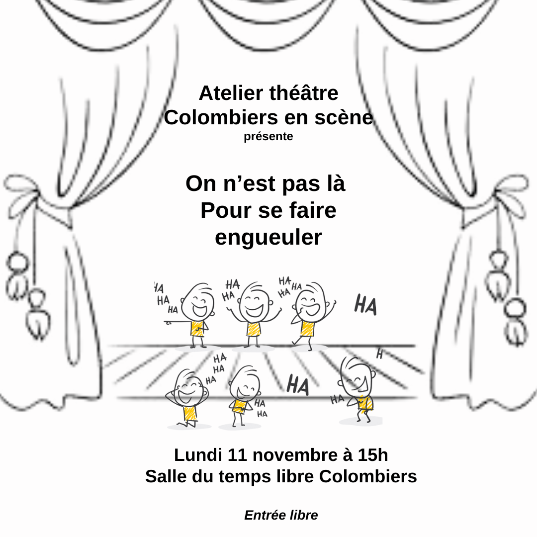 L’association “Colombiers en scène” vous propose le lundi 11 novembre 2024, un spectacle “On n’est pas là Pour se faire engueuler” à la Salle du Temps Libre.