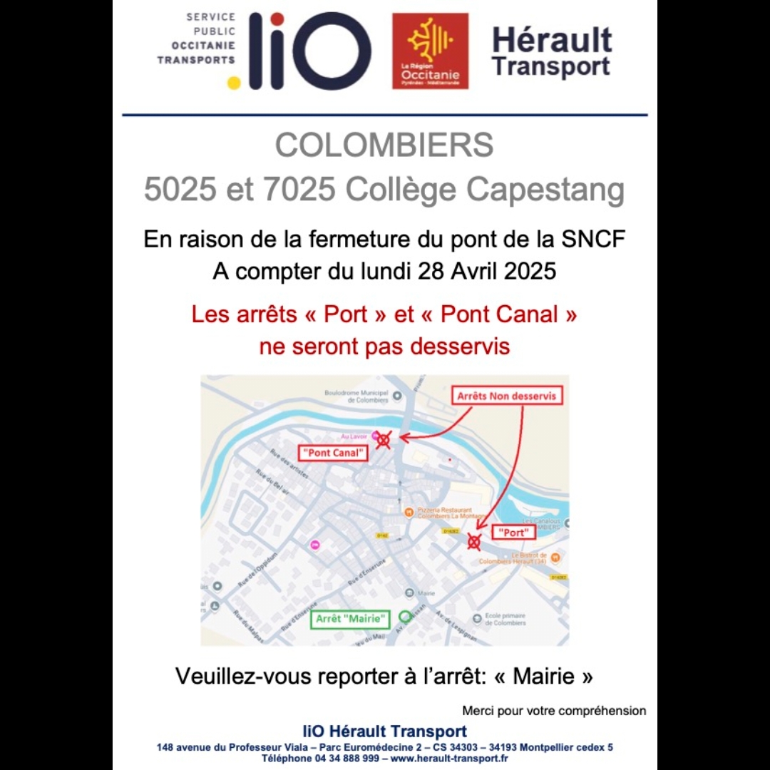 Suite aux travaux du Pont de la SNCF, les cars HĂ©rault-Transport â Lio ne pourront plus desservir les arrĂȘts «Port» et «Pont Canal» de Colombiers.