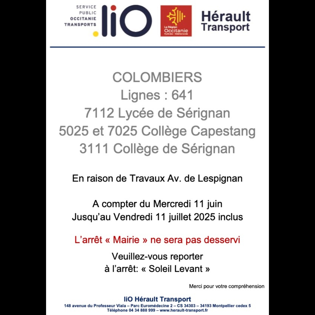 En raison de travaux sur l’avenue de Lespignan (travaux de rĂ©novation de toiture Ă la cantine des Ă©coles), les cars HĂ©rault-Transport â Lio ne pourront plus desservir l’arrĂȘt «Mairie» de Colombiers.
