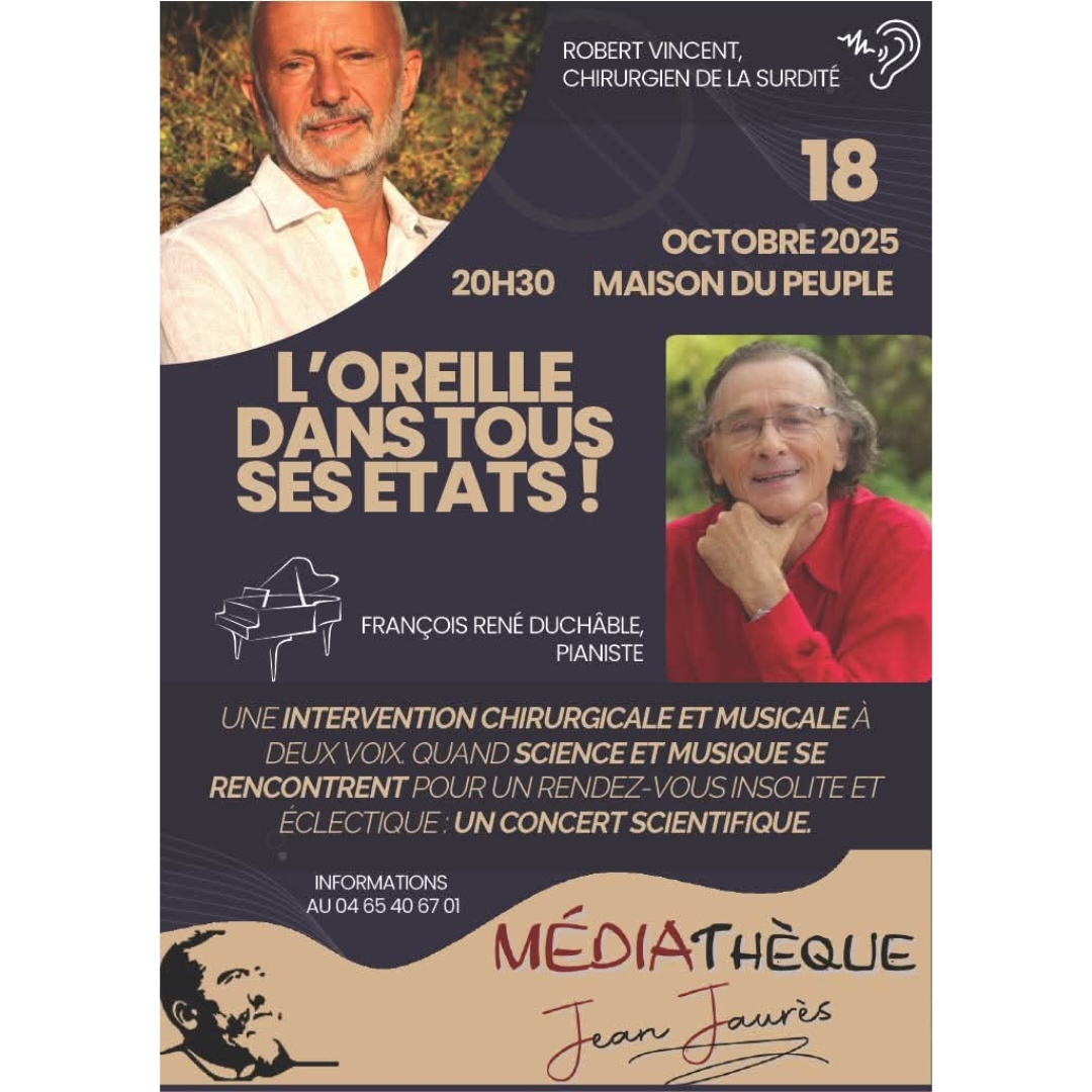 ” L’oreille dans tous ses états ! “ Un intervention chirurgicale et musicale à deux voix, quand science et musique se rencontrent pour un rendez-vous insolite et éclectique : un concert scientifique.  Avec François René…