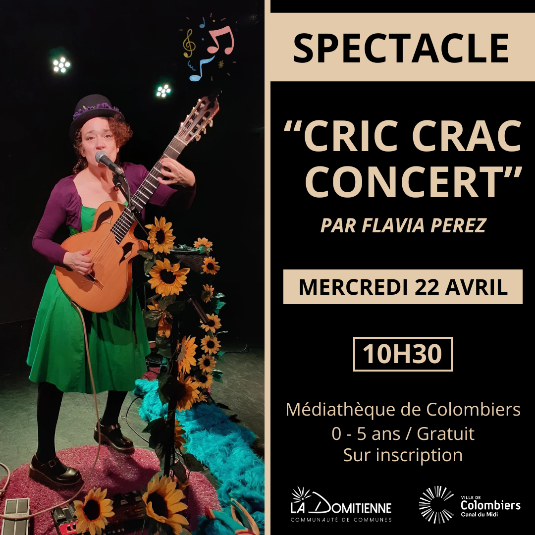 Mercredi 22 Avril à 10h30, la médiathèque de Colombiers vous propose un spectacle “Cric Crac Concert” par Flavia Perez à la Médiathèque. Un spectacle gratuit, sur inscription par mail à mediatheque.colombiers@ladomitienne.com ou par téléphone au 04.67.11.86.09 #villedecolombiers…