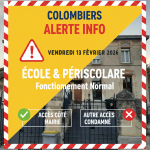 Nous vous informons que l’école primaire ainsi que l’ensemble des services périscolaires (garderie et cantine) fonctionneront normalement demain, vendredi 13 février.  Attention : Changement d’accès En raison de travaux ou de raisons techniques, l’organisation des entrées est modifiée:  Accès…