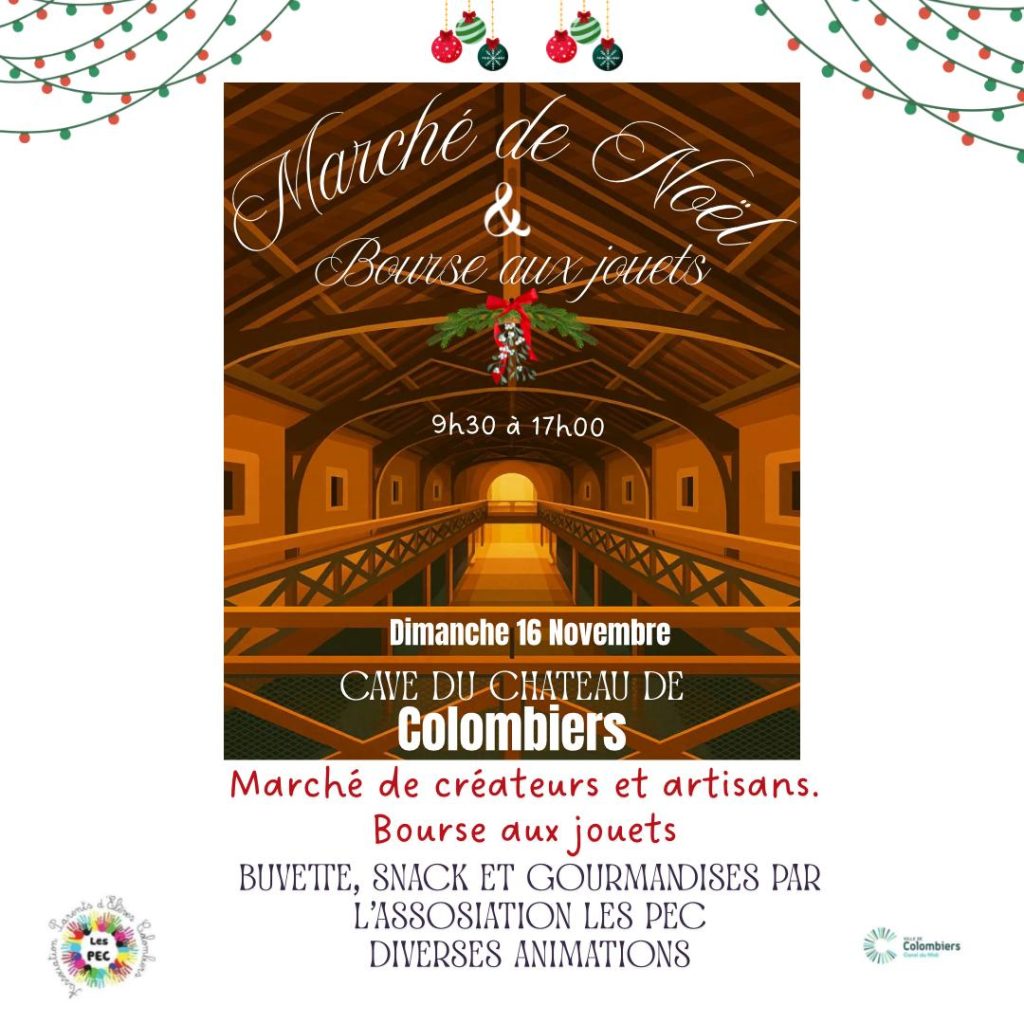Rendez-vous pour notre traditionnel Marché de Noël Dimanche 16 novembre De 9h30 à 17h00 À la cave du Château de Colombiers À l’étage de la cave : Marché de Noël avec de nombreux exposants créateurs, artisans, producteurs plein d’idées cadeaux ! Snack et buvette tenus par l’association Les PEC. Au bas de la cave :…