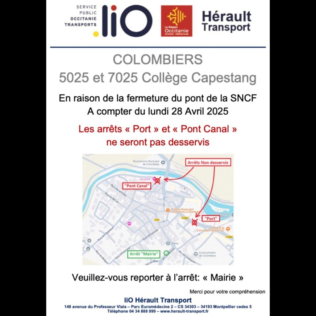 Suite aux travaux du Pont de la SNCF, les cars Hérault-Transport – Lio ne pourront plus desservir les arrêts «Port» et «Pont Canal» de Colombiers. A compter du lundi 28 avril 2025, retour des vacances de printemps, les collégiens de ces deux arrêts devront se reporter à l’arrêt «Mairie». L’arrêt « Faubourg » sera desservi par les…