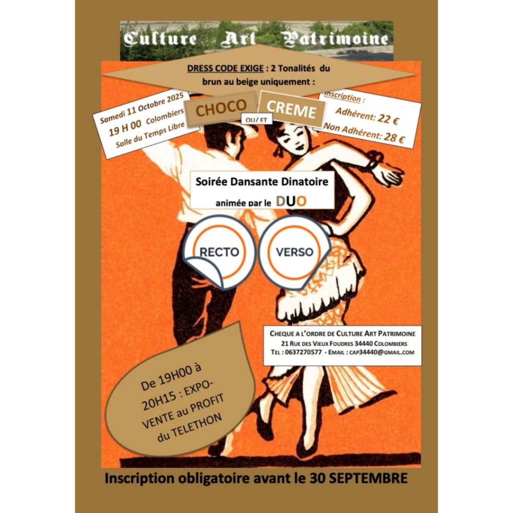 L’Association CAP (Culture Art Patrimoine) vous invite à une soirée dansante dinatoire. Samedi 11 Octobre 2025 19H00 Salle du Temps Libre Inscription obligatoire avant le 30 septembre 2025 06.37.27.05.77 cap34440@gmail.com Adhérent : 22€ / Non Adhérent : 28€ de 19h00 à 20h15 : Expo-vente au profit du Téléthon Dress Code : 2 tonalités du brun…