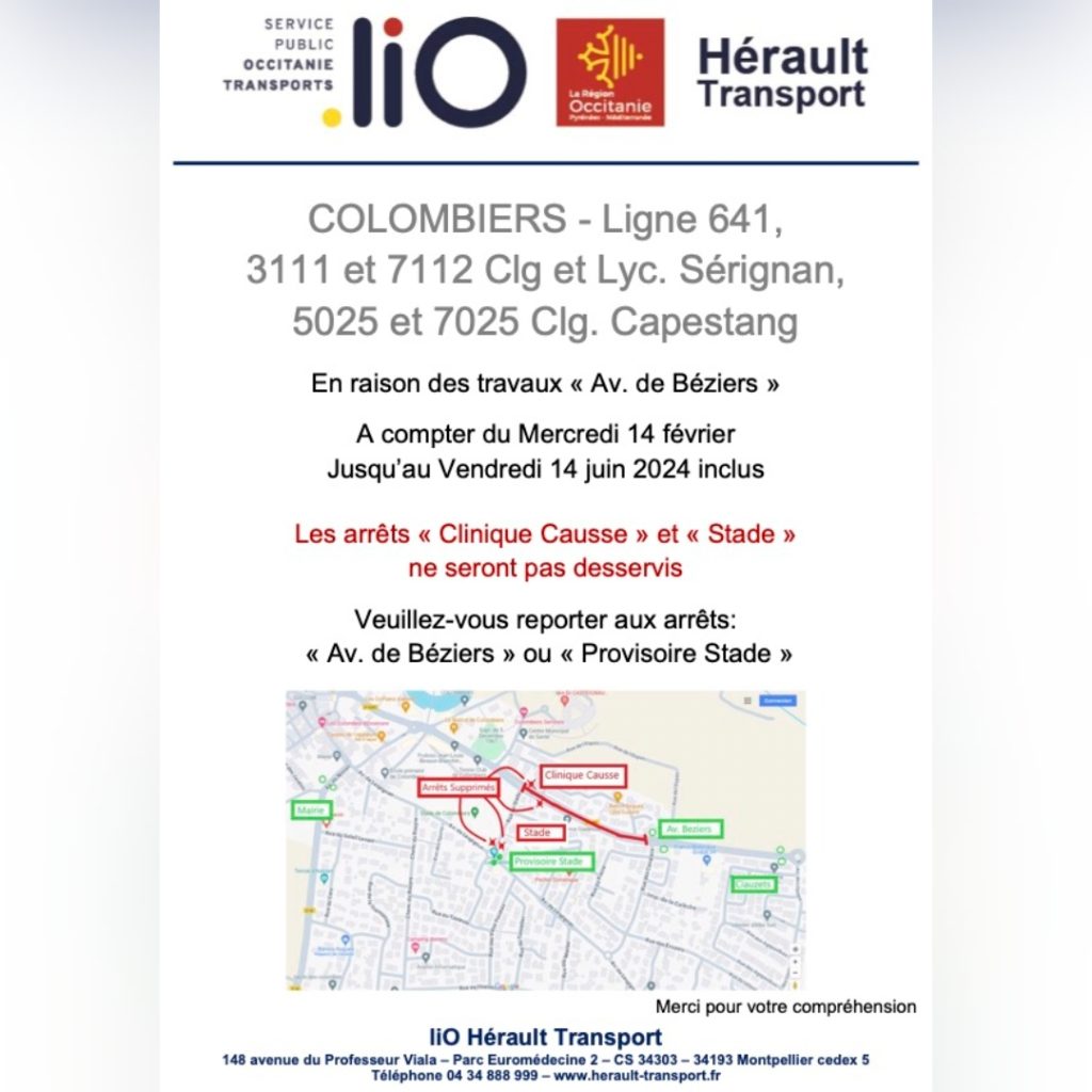 En raison des travaux sur l’avenue de Béziers, les arrêts “Clinique Causse” et “Stade” ne seront pas desservis à compter du mercredi 14 février, jusqu’au vendredi 14 juin 2024. Veuillez-vous reporter aux arrêts : “Avenue de Béziers” ou “provisoire Stade” #villedecolombiers #heraulttransport