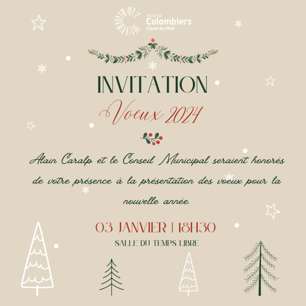 Alain CARALP et le Conseil Municipal seraient honorés de votre présence à la présentation des vœux pour la nouvelle année le mercredi 3 janvier 2024 à 18h30. Salle du Temps Libre – Colombiers Mercredi 3 Janvier 2024 18H30 #villedecolombiers #nouvelleannee #voeux2024 #herault #occitanie