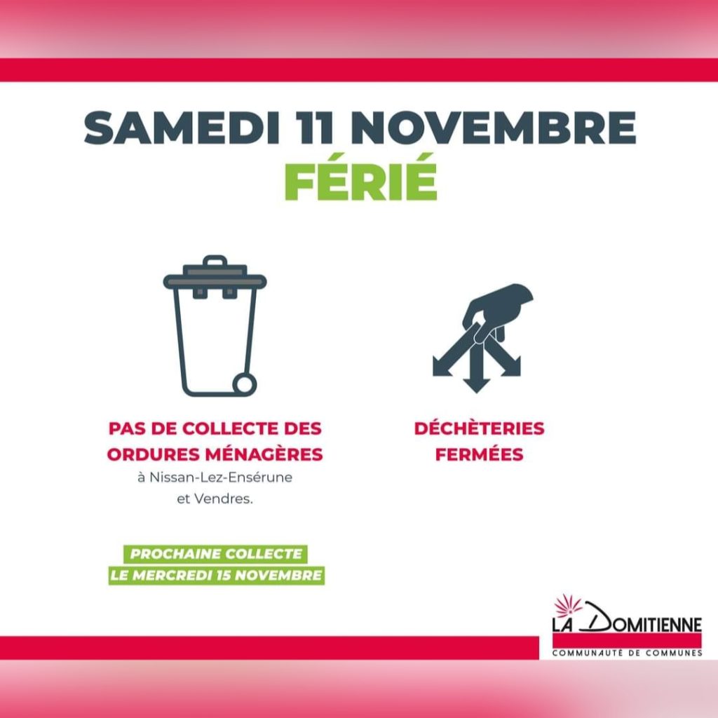 Pas de collecte des ordures ménagères pour Nissan-Lez-Ensérune et Vendres Les déchèteries de Cazouls-lès-Béziers et Nissan-Lez-Ensérune seront fermées.