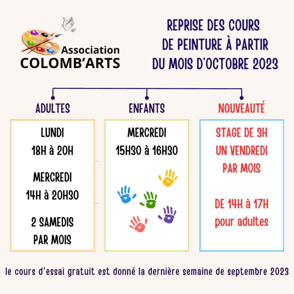 L’association Colomb’Arts vous informe de la reprise des cours de peinture à partir du mois d’octobre 2023. Adultes : les lundi de 18h à 20h, mercredi de 14h à 20h30 et 2 samedis par mois Enfants : les mercredis de 15h30 à 16h30 Nouveauté : stage de 3h un vendredi par mois…