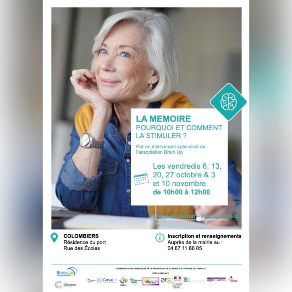 Le CCAS de Colombiers en partenariat avec l’association Brain Up vous invite à assister le 6 octobre 2023 de 10h à 12h à la conférence sur le thème « Ma mémoire, pourquoi et comment la stimuler ? » pour mieux comprendre comment pallier ces difficultés et rendre notre mémoire plus efficace. Puis à partir du 13 octobre de 10h…