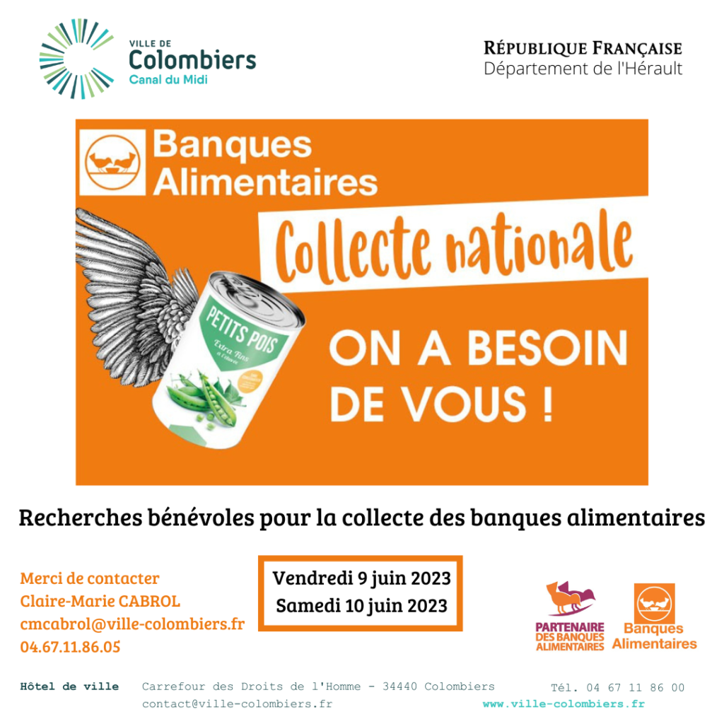 La collecte de la Banque Alimentaire est un temps fort pour soutenir les personnes en difficulté. Les personnes qui peuvent donner quelques heures de leur temps les 9 et 10 Juin 2023, merci de contacter Claire-Marie CABROL 04.67.11.86.05 cmcabrol@ville-colombiers.fr