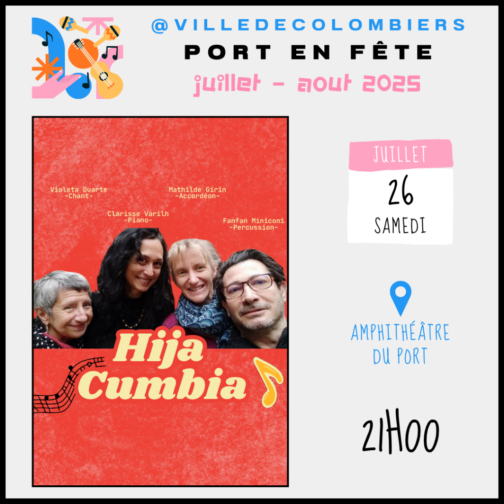 Samedi 26 juillet 2025 21h00 : Hija Cumbia Amphithéâtre du Port La musique latine, c’est plus qu’une danse, c’est une aventure sensorielle qui transporte et évoque des émotions intenses. Nos rythmes festifs et envoûtants vous invitent à voyager à travers des paysages sonores riches, entre nostalgie et célébration. Partagez avec nous une expérience musicale où…