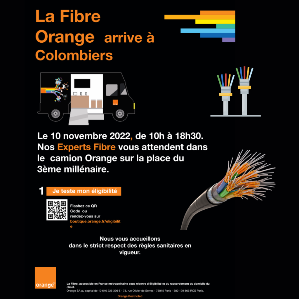 La fibre orange arrive à Colombiers le 10 Novembre 2022, de 10h à 18h30. Les Experts Fibre vous attendent dans le camion orange sur la Place du 3ème Millénaire.