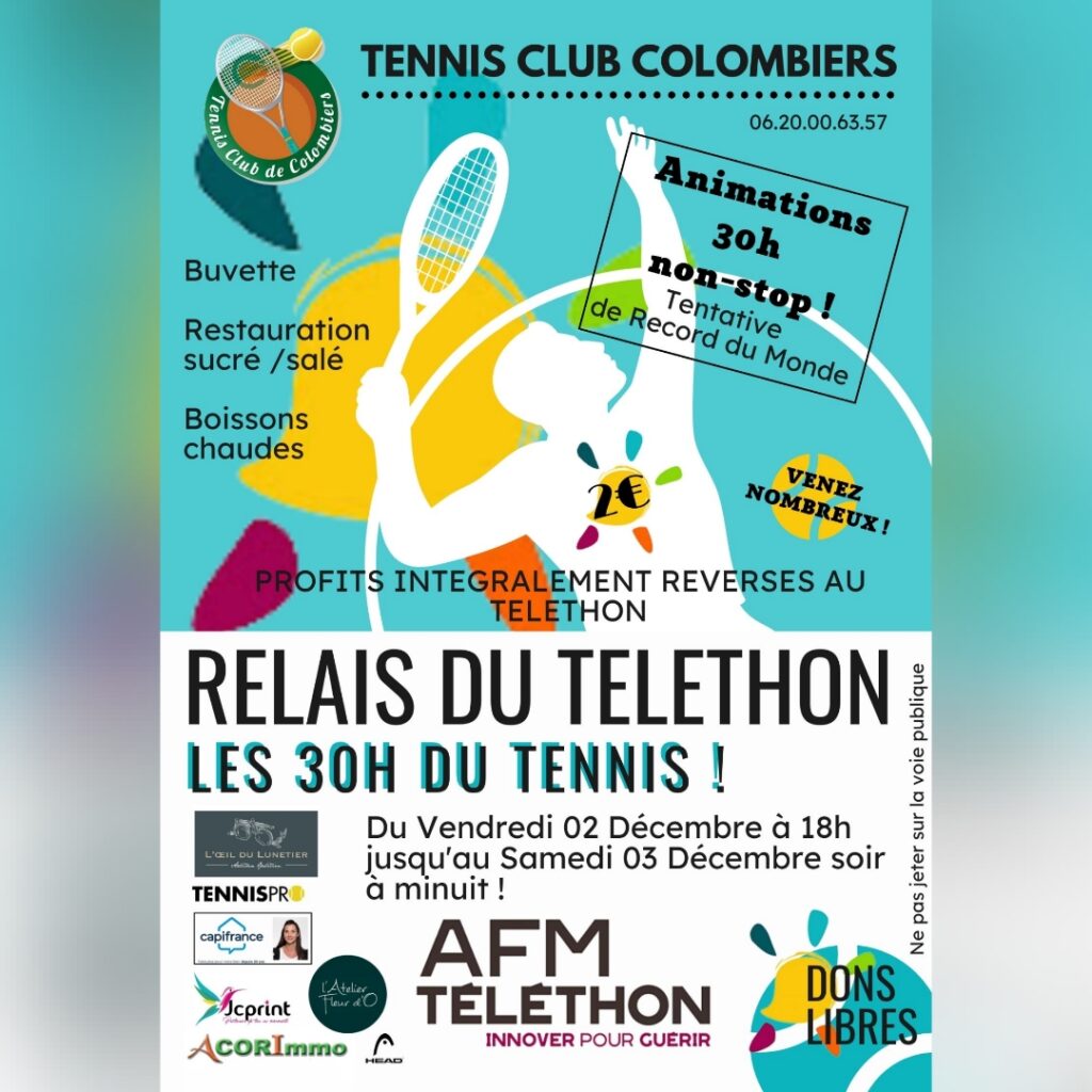 Du vendredi 2 Décembre à partir de 18h00 jusqu’au samedi 3 Décembre soir à minuit, le club de tennis organise une animation 30 heures non-stop sur les courts situés avenue de Béziers à Colombiers. La participation de 2€, les dons libres déposés dans l’urne, la recette de la buvette, des plats sucrés salés et des…