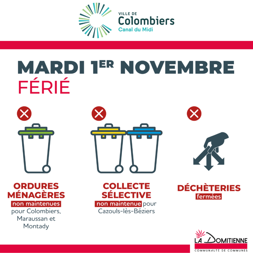 Pas de collecte des ordures ménagères à Colombiers, Maraussan et Montady. Pas de collecte sélective (bac jaune et bleu) à Cazouls-lès-Béziers Les déchèteries de Cazouls-lès-Béziers et Nissan-Lez-Ensérune seront fermées.