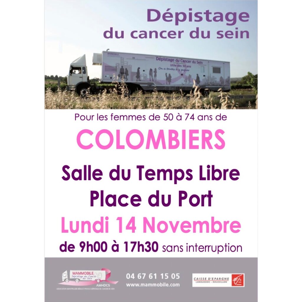 Le prochain passage du Mammobile pour le dépistage du cancer du sein des femmes de 50 à 74 ans aura lieu le 14 Novembre 2022 entre 09h00 et 17h30 devant la Salle du Temps Libre – Colombiers
