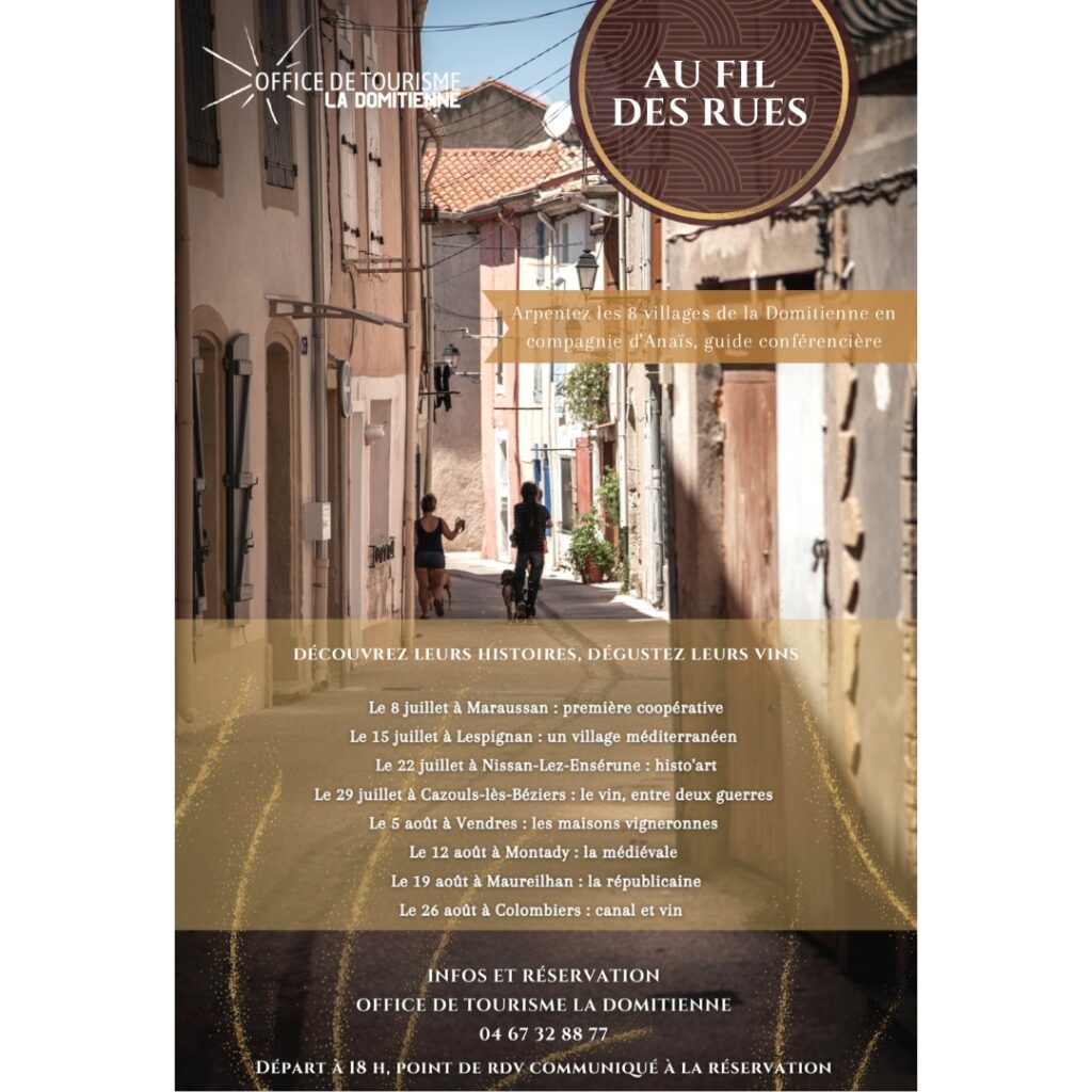 Pour la saison estivale 2022, l’Office de Tourisme renouvelle l’organisation des balades « Au fil des rues » dans les huit villages de La Domitienne en compagnie d’Anaïs, guide conférencière. Découvrez leurs histoires, dégustez leurs vins Infos et réservation : Office de Tourisme La Domitienne 04.67.32.88.77