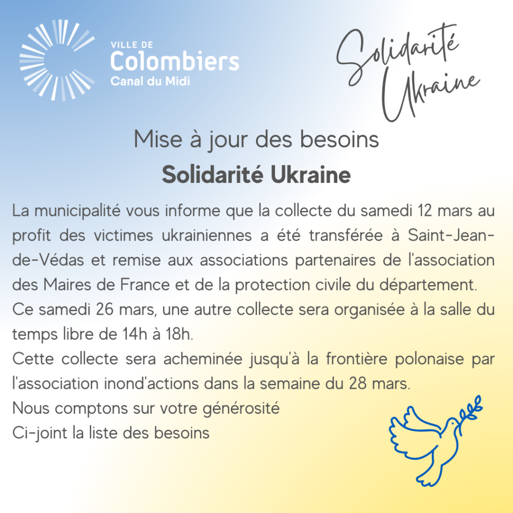 La municipalité vous informe que la collecte du samedi 12 mars au profit des victimes ukrainiennes a été transférée à Saint-Jean-de-Védas et remise aux associations partenaires de l’association des Maires de France et de la protection civile du département. Ce samedi 26 mars, une autre collecte sera organisée à la salle du temps libre de…