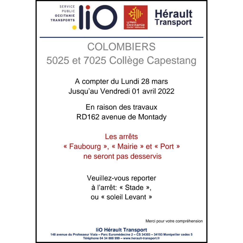 Information Hérault Transport En raison de l’interdiction de circulation “RD162 avenue de montady” à Colombiers, l’itinéraire du car du collège de Capestang sera dévié pendant les travaux. Les arrêts “Port”, “Mairie” et “Faubourg” ne seront pas desservie. Les collégiens devront se reporter aux arrêts “Stade” et “Soleil Levant” Merci pour votre compréhension. #villedecolombiers #heraulttransport
