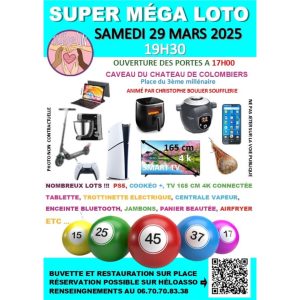 Le Samedi 29 Mars, à la Cave du Château de Colombiers. Ouverture des portes à 17h00 Début du Loto à 19h30 Restauration buvette sur place ️ Réservation non obligatoire #villedecolombiers #loto #touspourun