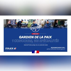 Plusieurs milliers de postes sur toute la France! La police nationale organise un concours pour recruter et former de futurs gardiens de la paix. Les inscriptions sont ouvertes en ligne jusqu’au 22 janvier 2025. Les premières épreuves débuteront le 11 mars 2025. + d’informations sur notre site carrière: https://www.police-nationale.interieur.gouv.fr/nous-rejoindre/nos-voies-dacces/devenir-policier/gpx/ext Inscriptions: https://www.police-nationale.interieur.gouv.fr/nous-rejoindre/inscriptions-aux-concours-et-selections/gardien-de-paix-1re-session-2025-concours Une question, un renseignement…