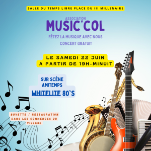 L’association Music’Col vous invite le samedi 22 Juin 2024 dès 19h pour un concert gratuit Sur scène amitemps WHITELITE 80’s Salle du Temps Libre – Place du IIIème Millénaire Samedi 22 Juin 2024 à partir de 19h – minuit Buvette / restauration : dans les commerces du village ️ Concert Gratuit Venez nombreux #villedecolombiers #musiccol…