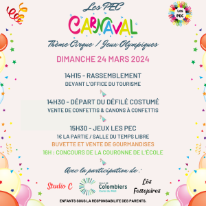 Vous l’attendiez avec impatience, LES PEC ressortent leur carnaval tout en couleur cette année ! Studio C Colombiers nous prépare une parade sportive , nos musiciens bénévoles nous accompagneront en fanfare. Et la Mairie nous offrira une animation de taille qui devrait ravir petits et grands ! Psss, nous avons doublé le stock de confettis et…