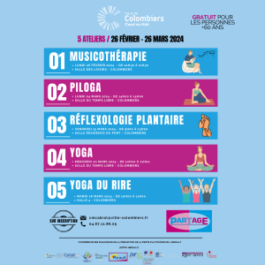 Avec la participation de l’association PARTAGE, le CCAS de Colombiers met en place 5 ateliers gratuit pour les personnes de +60ans du 26 février au 26 mars 2024. 1. MUSICOTHÉRAPIE Lundi 26 Février 2024 De 10h30 à 11h30 Salle des loisirs – Colombiers 2. PILOGA Lundi 4 Mars 2024 De 14h à 15h Salle du…
