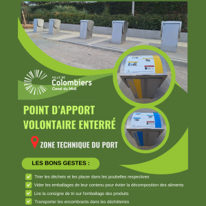 La ville de Colombiers vient d’être équipée sur la zone technique du Port, de 5 bornes enterrées dont 2 pour les ordures ménagères, 1 pour les emballages, 1 pour les magazines-journaux et 1 pour le verre. Elles sont opérationnelles depuis 1 semaine et réservées a l’utilisation des Colombiérains. Nous vous rappelons les bons gestes à…