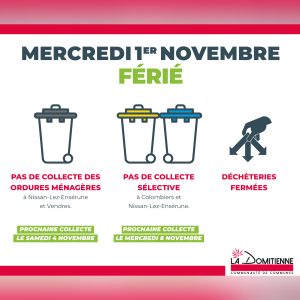 Pas de collecte des ordures ménagères pour Nissan-Lez-Ensérune et Vendres Pas de collecte des produits recyclables (bacs jaune et bleu) pour Colombiers et Nissan-Lez-Ensérune Les déchèteries de Cazouls-lès-Béziers et Nissan-Lez-Ensérune seront fermées.