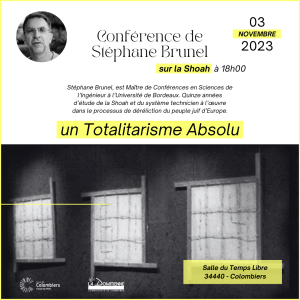 Stéphane Brunel, est Maître de Conférences en Sciences de l’Ingénieur à l’Université de Bordeaux. Quinze années d’étude de la Shoah et du système technicien à l’œuvre dans le processus de déréliction du peuple juif d’Europe Conférence sur la Shoah Stéphane Brunel Un Totalitarisme Absolu le vendredi 3 novembre 2023 à 18h00 Salle du Temps Libre…