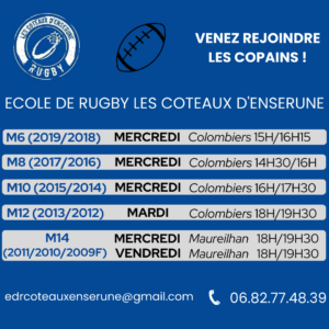 Programme de reprise des entraînements L’école de rugby des Coteaux d’Ensérune reprend ses entraînements : – M6-M8-M10 / Dès le mercredi 06 septembre à Colombiers – M12 / Dès le mardi 05 septembre à Colombiers – M14 / Dès le mercredi 06 septembre à Maureilhan #villedecolombiers #ecolederugby #coteauxdenserune