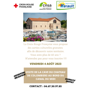 La Croix-Rouge Française vous propose des sorties culturelles gratuites afin de découvrir notre territoire. Vous avez plus de 60 ans? le vendredi 4 août 2023 La cave du Château de Colombiers Inscription obligatoire Pour obtenir des informations supplémentaires ou vous inscrire, veuillez contacter : Mme Angélique BARD 04.67.30.97.85 adj-ehpad.nissan@croix-rouge.fr #villedecolombiers #croixrouge #herault #occitanie