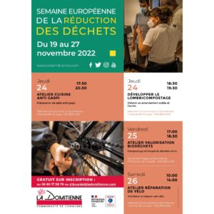 A l’occasion de la #SERD, profitez d’ateliers gratuits du 24 au 26 novembre ! Cuisine anti-gaspi, lombricomposteur, valorisation des biodéchets, réparation de vélo… C’est gratuit, sur inscription : 06 80 17 08 78 d.bourdel@ladomitienne.com