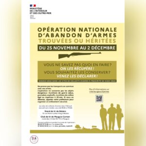 Du 25 novembre au 2 décembre 2022, le ministère de l’Intérieur organise une opération d’abandon simplifié d’armes à l’État. Durant cette période les particuliers détenteurs d’armes non déclarés trouvées ou héritées pourront se rendre sur les sites de collecte ouverts : – soit pour remettre physiquement les armes qu’ils ne veulent pas garder, – soit…