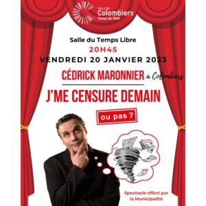 La commune vous propose un spectacle qui mêle humour et imitations avec Cédrick Maronnier. Salle du Temps Libre – Colombiers Vendredi 20 Janvier 2023 20H45 Spectacle offert par la Municipalité