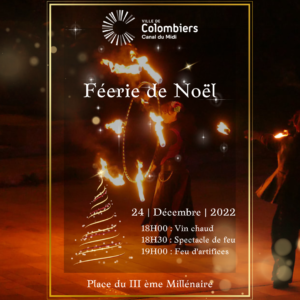 Le samedi 24 décembre 2022 à 18h nous vous attendons nombreux sur la Place du 3ème Millénaire pour profiter d’un spectacle de feu suivi d’un feu d’artifice. Samedi 24 décembre 2022 Place du III ème Millénaire 18H00 Vin chaud 18H30 Spectacle de feu 19H00 Feu d’artifice