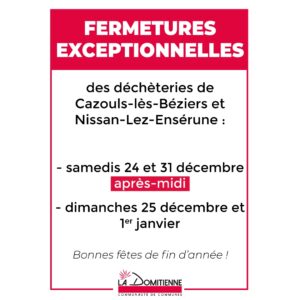 Les déchèteries de Cazouls-lès-Béziers & Nissan Lez Ensérune seront fermées samedis 24 et 31 décembre après-midi et dimanches 25 et 1er janvier toute la journée.