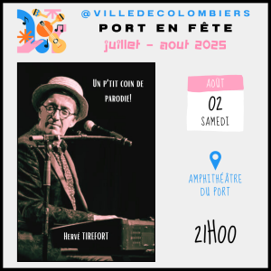 Samedi 2 Août 2025 21h00 : Hervé Tirefort Amphithéâtre du Port Hervé Tirefort propose un one man show musical, dans la lignée des chansonniers… Chansons, parodies, sketches, pastiches, impros et une performance inédite, l’imitation à la carte. #villedecolombiers #portenfete #animations #concert #spectacle #comediemusicale #juillet2025 #aout2025 #feudartifices #musique #herault #occitanie