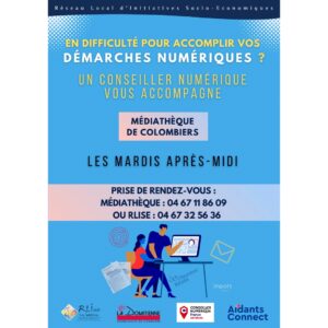 “Démarches administratives sur internet” Colombiérains, venez vous initier avec Claire-Marie, Myriam et Émilie, les jeudis de 09h30 – 12h00 à la médiathèque. Places limitées, inscription obligatoire : 04.67.11.86.05 cmcabrol@ville-colombiers.fr