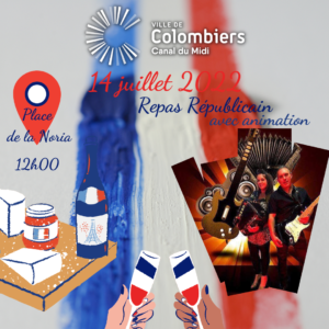 Jeudi 14 Juillet 2022 Place de la Noria 12h00 En duo Sylvie Maubert et Yann Bellet La vente des billets (10€ adultes / 8€ enfants) pour le repas est prévue à l’office de Tourisme à compter du mercredi 6 juillet. A vos agendas
