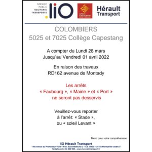 Information Hérault Transport En raison de l’interdiction de circulation “RD162 avenue de montady” à Colombiers, l’itinéraire du car du collège de Capestang sera dévié pendant les travaux. Les arrêts “Port”, “Mairie” et “Faubourg” ne seront pas desservie. Les collégiens devront se reporter aux arrêts “Stade” et “Soleil Levant” Merci pour votre compréhension. #villedecolombiers #heraulttransport