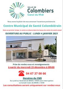 Nous avons le plaisir de vous annoncer l’ouverture prochaine du Centre Municipal de Santé Colombiérain Dans un premier temps, le centre se situera dans les locaux du centre de santé actuel La date de l’ouverture au public sera le Lundi 4 Janvier 2021 et les prises de rendez-vous se feront à partir du mercredi 23…