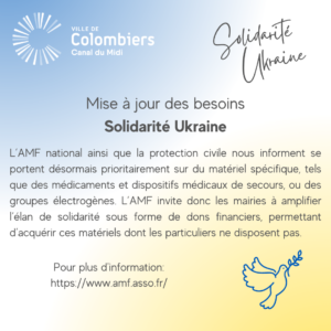 L’AMF national ainsi que la protection civile nous informent que les besoins se portent désormais prioritairement sur du matériel spécifique, tels que des médicaments et dispositifs médicaux de secours, ou des groupes électrogènes. L’AMF invite donc les mairies à amplifier l’élan de solidarité sous forme de dons financiers, permettant d’acquérir ces matériels dont les particuliers…