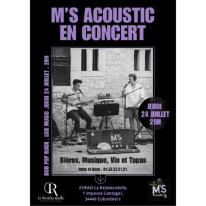 Envie d’une soirée d’été en musique, sous les étoiles ? Rendez-vous au parc de la Résidentielle pour une soirée live avec M’S ACOUSTIC, un duo pop rock qui revisite avec énergie les plus grands titres ! Sur place : vins, bières artisanales & tapas à savourer dans une ambiance chaleureuse et détendue. Jeudi 24 juillet…